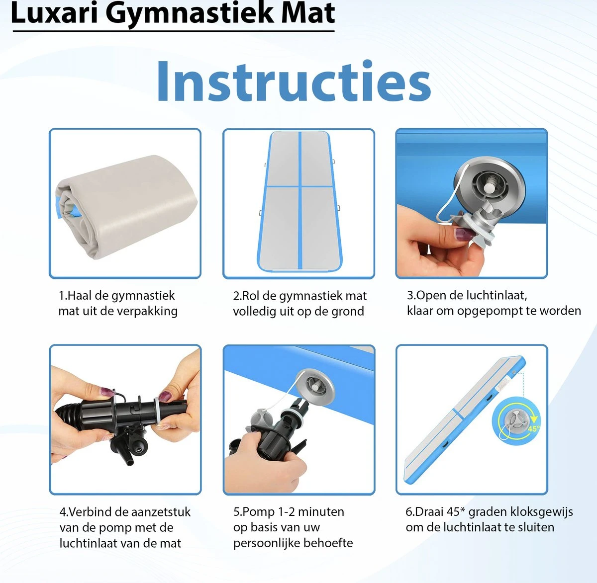 U ontvangt van ons een complete set. U kunt de mat naar uw eigen wensen vullen door middel van onze elektrische 600 Watt luchtpomp. De mat zelf kunt u gemakkelijk inklappen en opbergen in de opbergtas die u erbij ontvangt. Hiermee kunt u ook gemakkelijk de AirTrack meenemen naar een andere locatie.