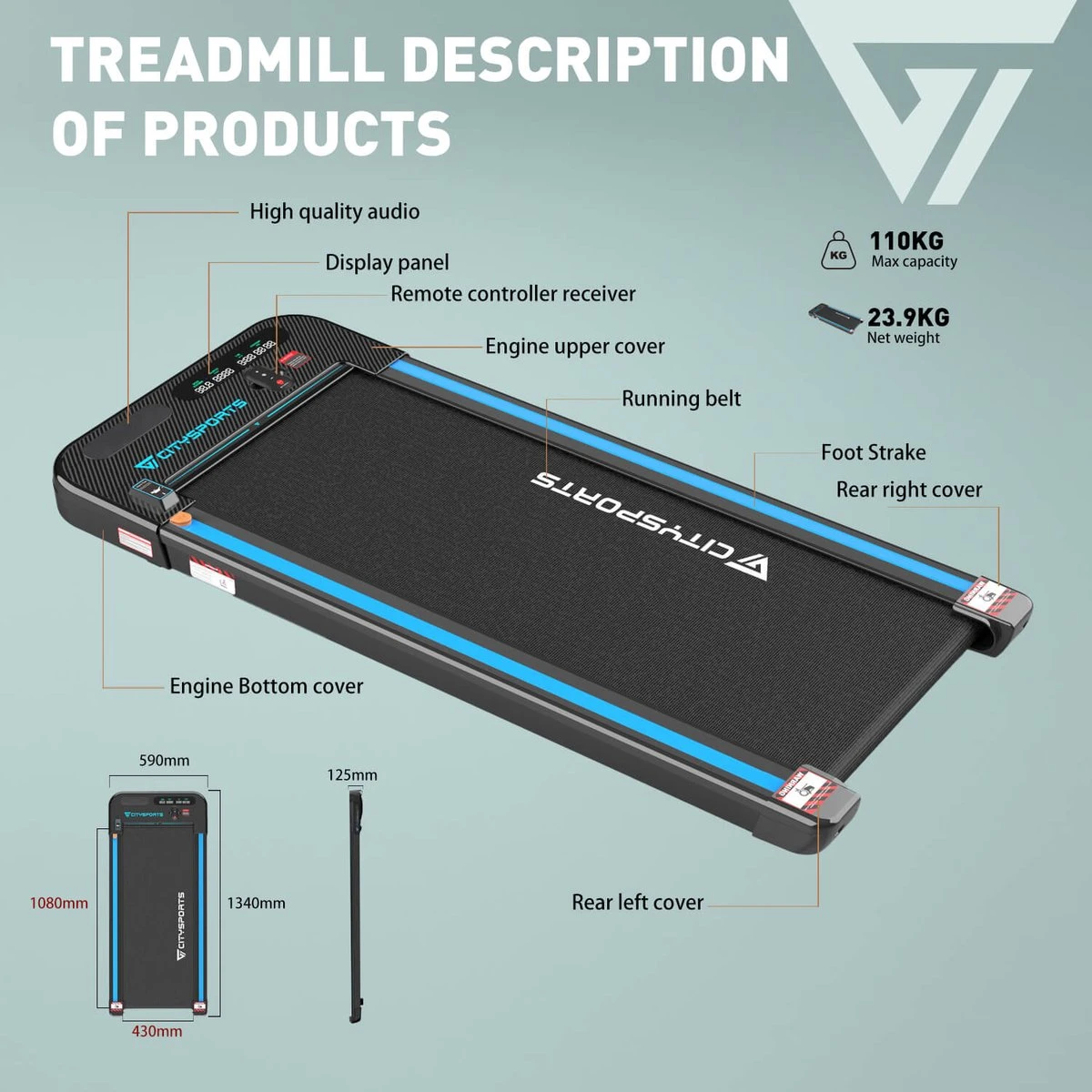 Merkloos CITYSPORTS Loopband, Elektrisch, Motor 440 W, Lcd-display En Calorieënteller, Geïntegreerde Bluetooth-luidspreker, Instelbare Snelheid, Ultradun En Stil, Voor Thuis/kantoor