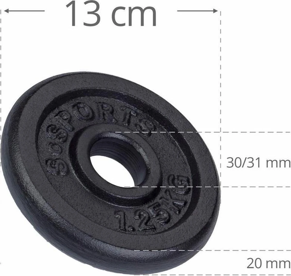 – Afmetingen 1,25 kg halterschijf: Ø ca. 13 cm, dikte ca. 2 cm