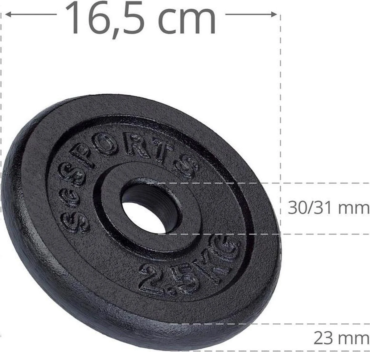 – Afmetingen 2,5 kg halterschijf: Ø ca. 16,5 cm, dikte ca. 2,3 cm