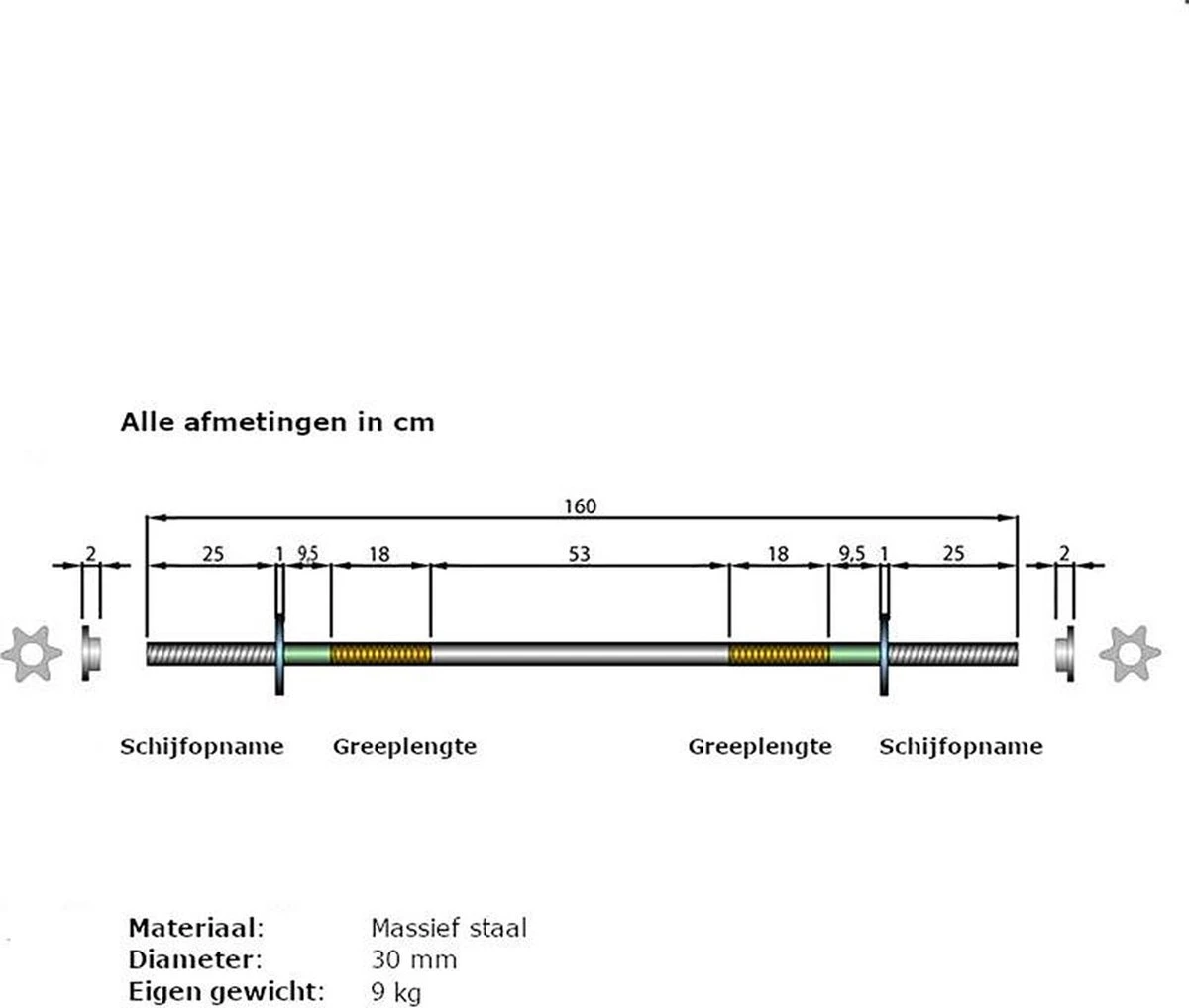 - Lange halterstang: verchoomd staal, 160 cm lang, diameter 30 mm , 9 kg, max belastbaarheid: 120 kg