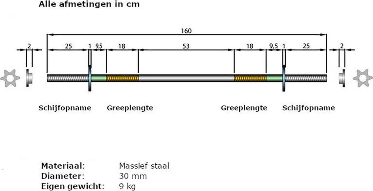 - Afmetingen 7,5 kg halterschijf: Ø 31 cm, dikte 5,2 cm