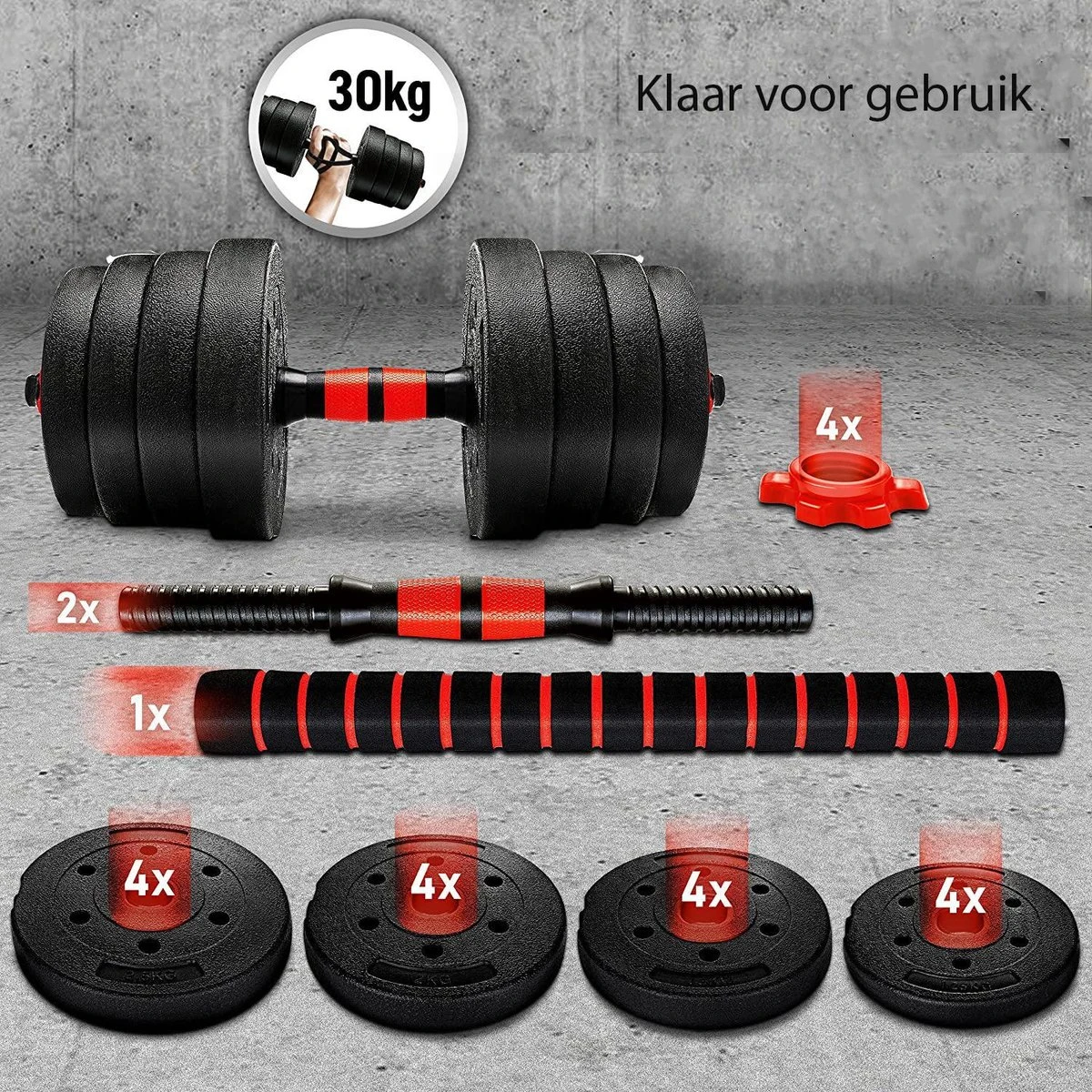✔ Inclusief 4x gewicht 1,25kg, 4x gewicht 1,5kg, 4x gewicht 2kg en 4x gewicht 2,5 kg, 2 metalen stangen, 1 verbindingsstuk en 4 veiligheidsverbindingen