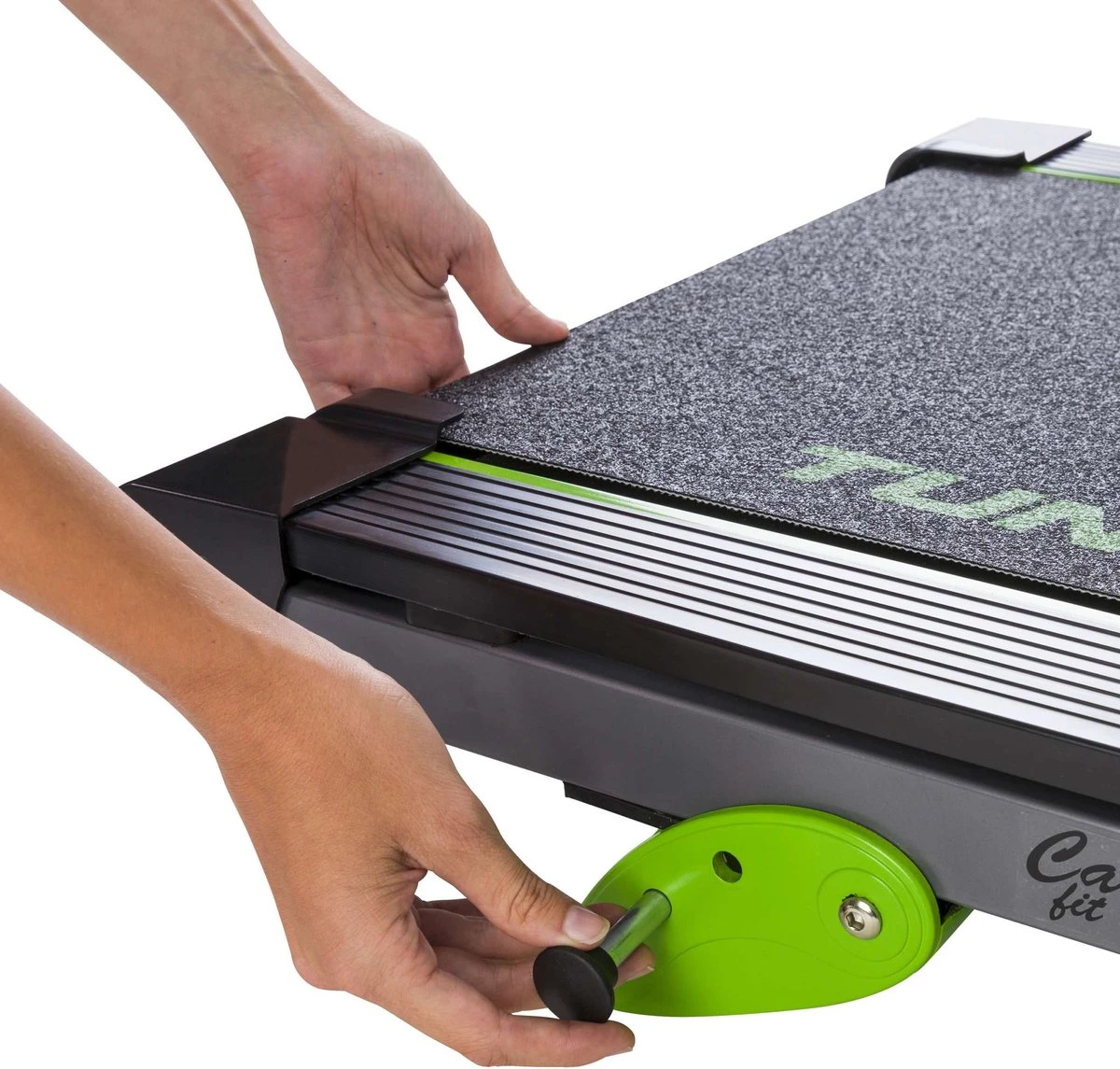 De loopband is opklapbaar: je bergt hem netjes op. Loop waar jij wil: met de transportwielen onderaan de loopband verplaats je de T30 in een vlotte beweging.