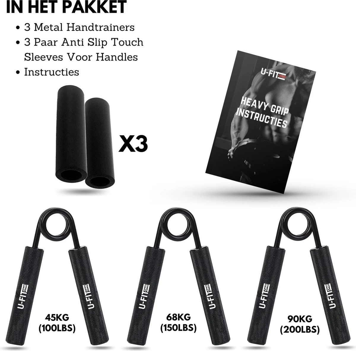 U-Fit One 3 Delige Metal Handtrainer Set – 45kg, 68kg, 90kg – Grip Trainer – Handknijper – Knijphalter – Armtrainer – Hand Knijper – Handgripper – Heavy Gripper – Onderarm – Buigveer – Zwart
